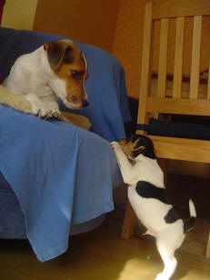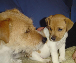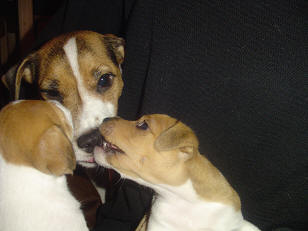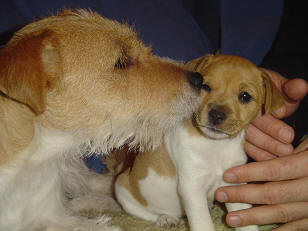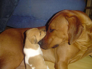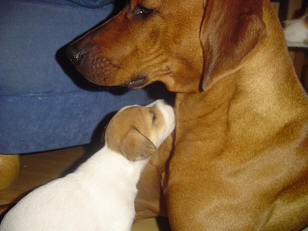 Großer Austausch von Zärtlichkeiten und keine Angst vor großen Hunden.