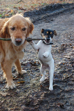 Irgendwie habe ich den Verdacht, dass die Hündin ihr Stöckchen nicht mit so einem kleinen lästigen Zwerg teilen möchte. Aber niedlich sind die Zwei trotzdem zusammen